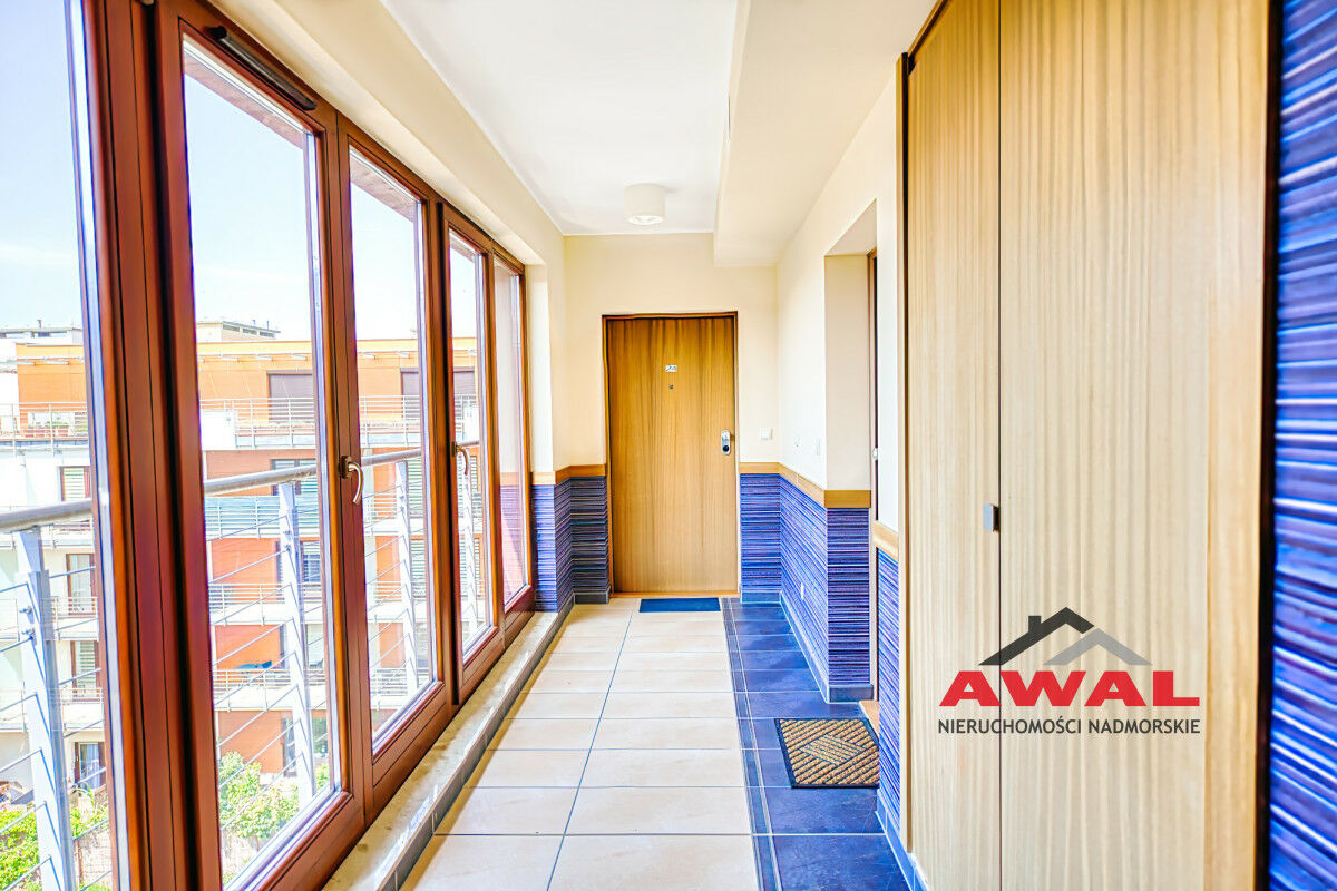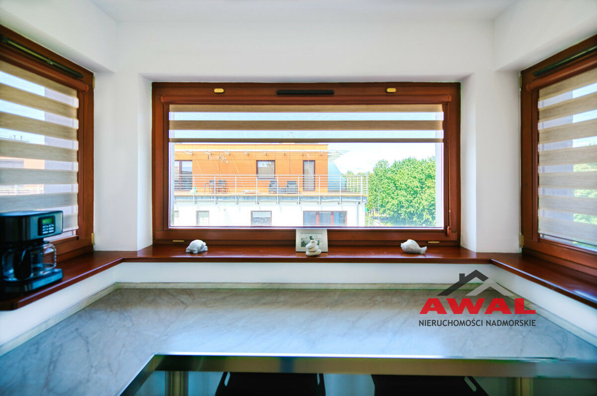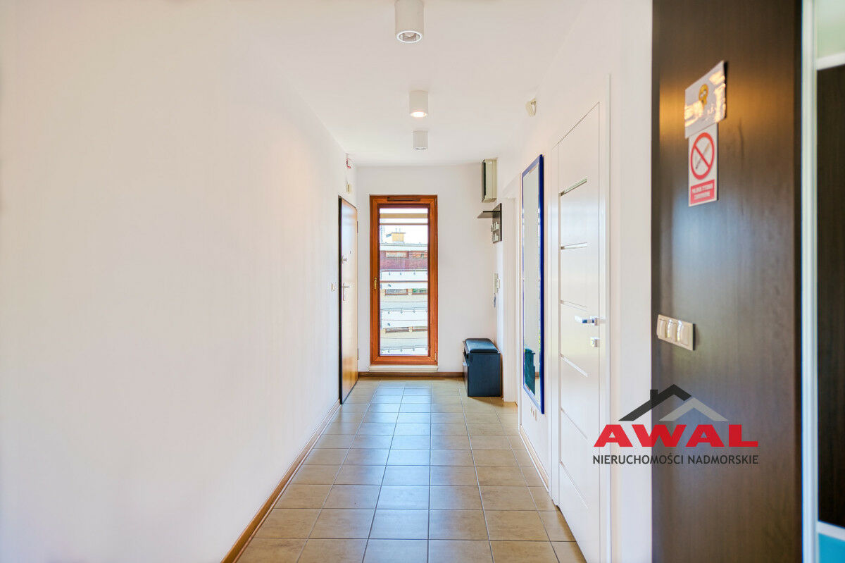 Lokal położony jest na ostatniej czwartej kondygnacji charakterystycznego apartamentowca o zaokrąglonej architekturze. Helska Villa znajduje się na ogrodzonym, monitorowanym terenie, w budynku z recepcją oraz ochroną. Klatki schodowe nowoczesne i zadbane, do apartamentu dojedziemy cichobieżną windą. Wejście do mieszkania z przeszklonego holu z widokiem na wewnętrzny dziedziniec apartamentowca. Część budynku, w której znajduje się apartament, jest po remoncie zewnętrznej elewacji.