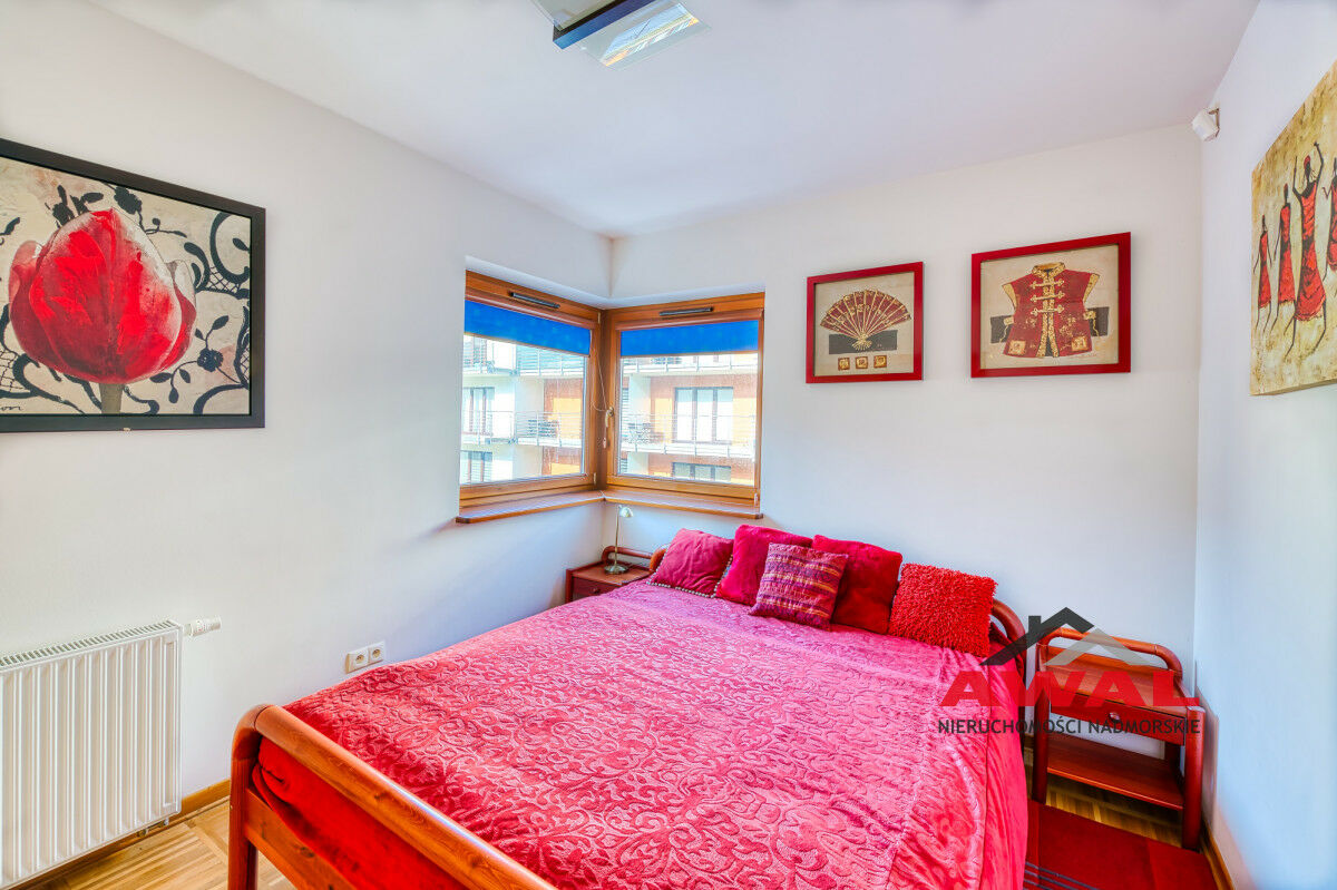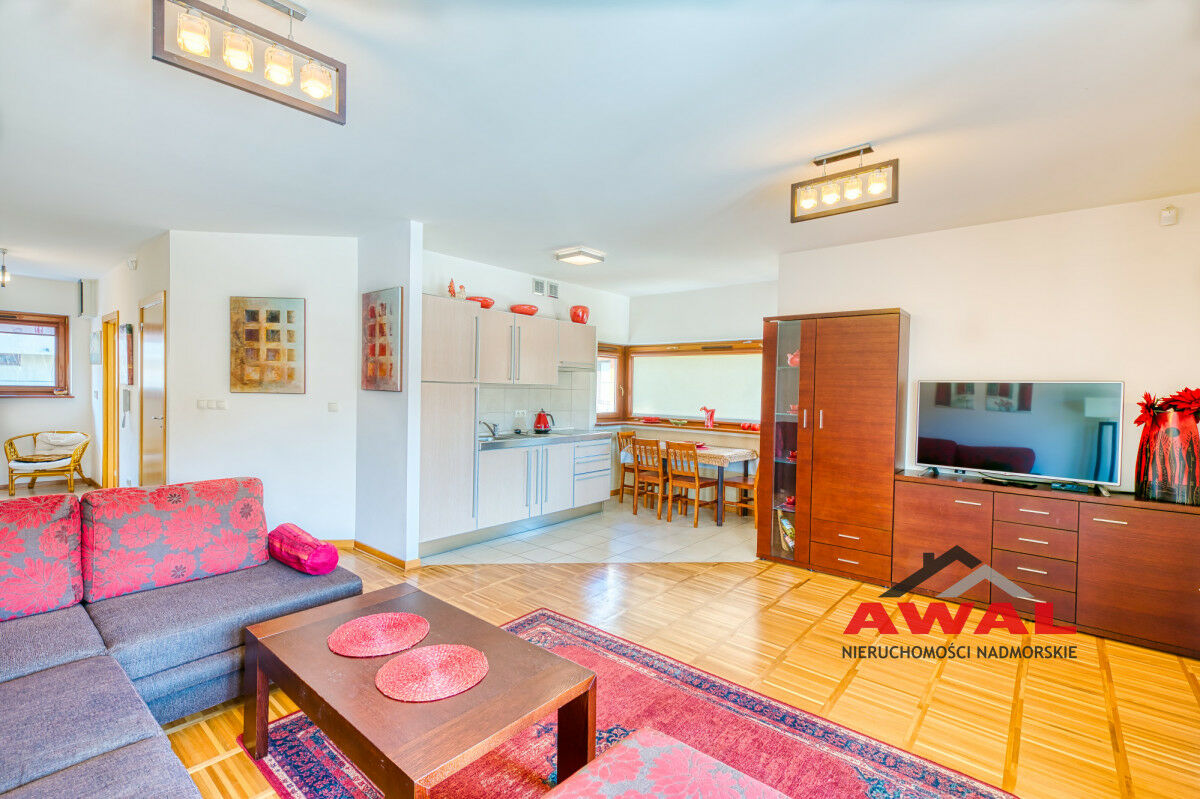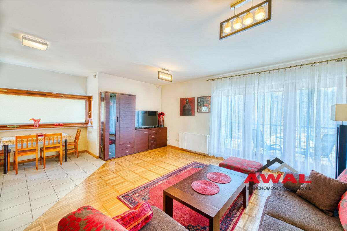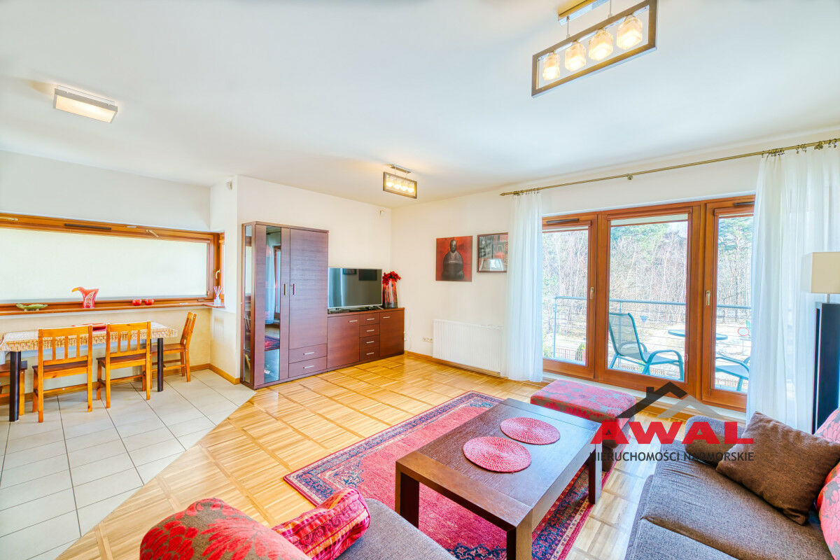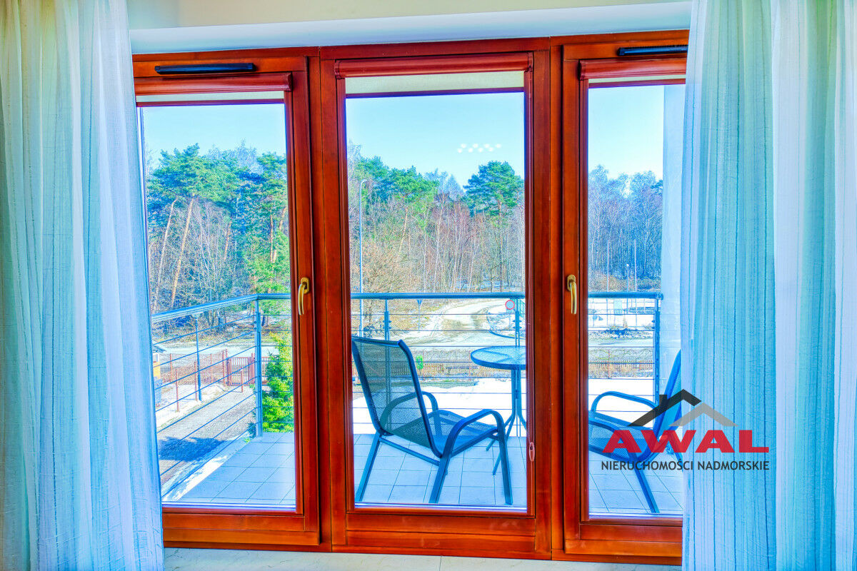 Wejście do mieszkania z przeszklonego holu z widokiem na wewnętrzny dziedziniec apartamentowca. Lokal mieszkalny bardzo jasny z trzystronną wystawą okien. Przestronny salon z wydzielonym aneksem kuchennym połączony jest z przedpokojem. W salonie trzysegmentowe okno balkonowe z podwójnymi drzwiami, aneks kuchenny doświetlony trzema oknami, w przedpokoju również okno. Sypialnia urokliwa, z narożnym oknem. Łazienka z wanną oraz pralką. W aneksie kuchennym meble w zabudowie stałej, na wyposażeniu lodówka, płyta indukcyjna, wyciąg pary, zlew jednokomorowy ze stali nierdzewnej. Z salonu wyjście na duży balkon o powierzchni 4,8 m², z widokiem na las Nadmorskiego Parku Krajobrazowego.