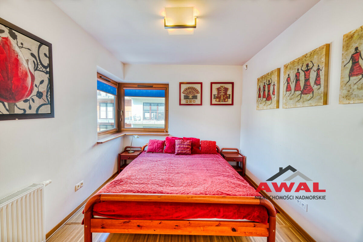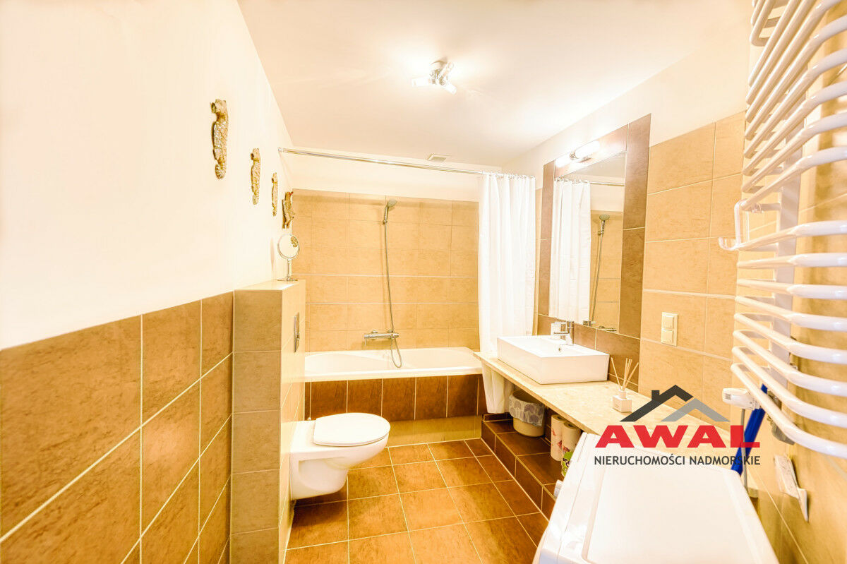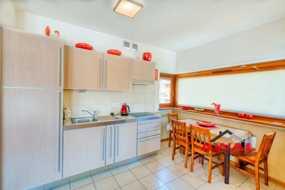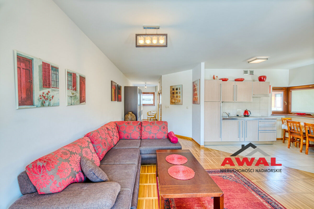 Wejście do mieszkania z przeszklonego holu z widokiem na wewnętrzny dziedziniec apartamentowca. Lokal mieszkalny bardzo jasny z trzystronną wystawą okien. Przestronny salon z wydzielonym aneksem kuchennym połączony jest z przedpokojem. W salonie trzysegmentowe okno balkonowe z podwójnymi drzwiami, aneks kuchenny doświetlony trzema oknami, w przedpokoju również okno. Sypialnia urokliwa, z narożnym oknem. Łazienka z wanną oraz pralką. W aneksie kuchennym meble w zabudowie stałej, na wyposażeniu lodówka, płyta indukcyjna, wyciąg pary, zlew jednokomorowy ze stali nierdzewnej. Z salonu wyjście na duży balkon o powierzchni 4,8 m², z widokiem na las Nadmorskiego Parku Krajobrazowego.