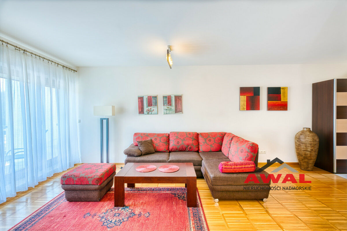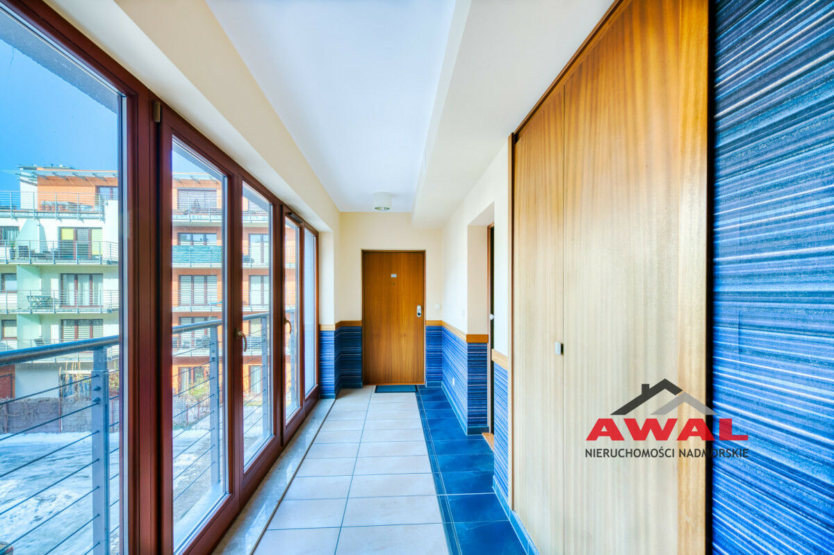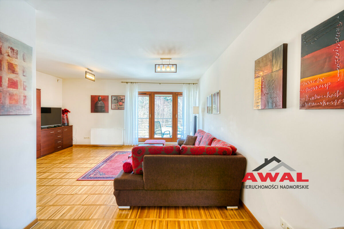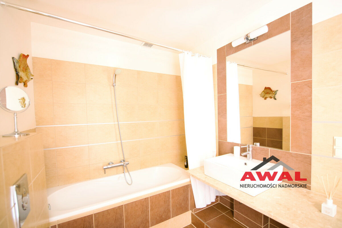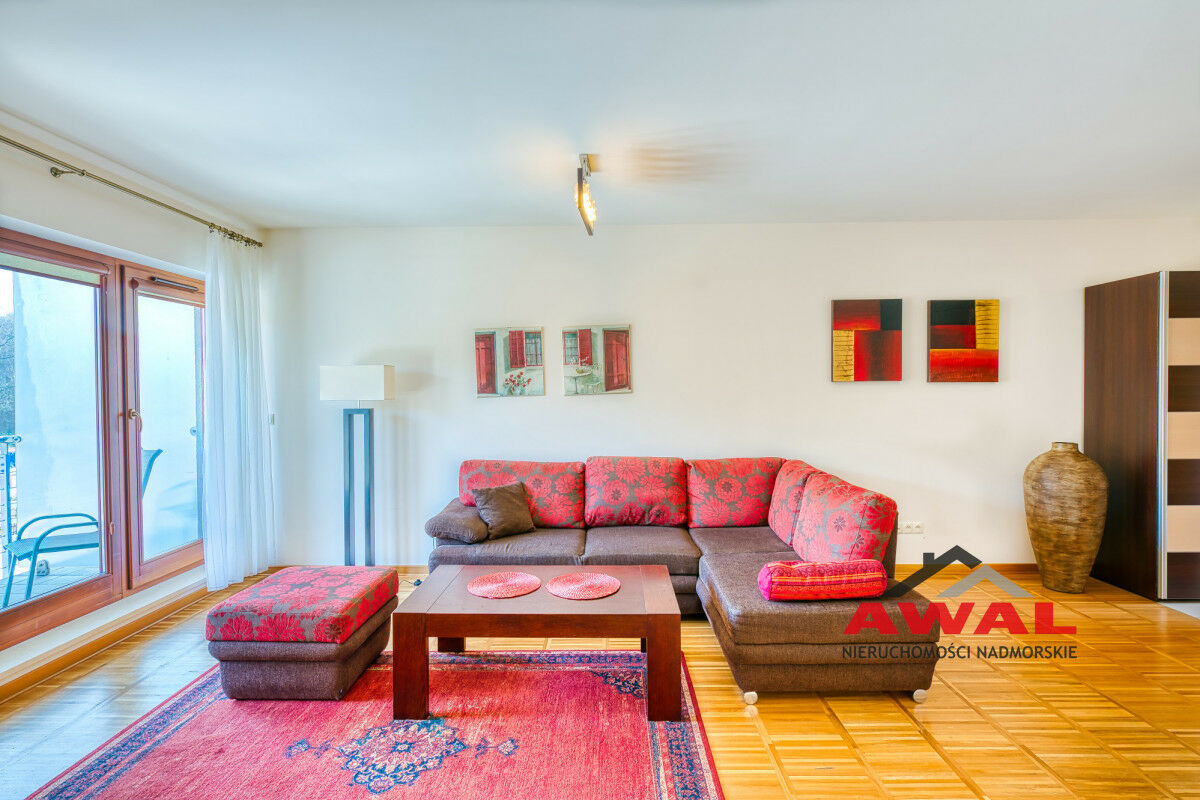 Wejście do mieszkania z przeszklonego holu z widokiem na wewnętrzny dziedziniec apartamentowca. Lokal mieszkalny bardzo jasny z trzystronną wystawą okien. Przestronny salon z wydzielonym aneksem kuchennym połączony jest z przedpokojem. W salonie trzysegmentowe okno balkonowe z podwójnymi drzwiami, aneks kuchenny doświetlony trzema oknami, w przedpokoju również okno. Sypialnia urokliwa, z narożnym oknem. Łazienka z wanną oraz pralką. W aneksie kuchennym meble w zabudowie stałej, na wyposażeniu lodówka, płyta indukcyjna, wyciąg pary, zlew jednokomorowy ze stali nierdzewnej. Z salonu wyjście na duży balkon o powierzchni 4,8 m², z widokiem na las Nadmorskiego Parku Krajobrazowego.