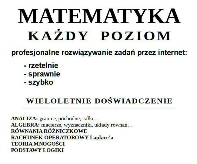 Rozwiązuję zadania z matematyki zdalnie - przez internet. Oferuję każdy poziom nauczani: szkoła podstawowa, średnia, ...